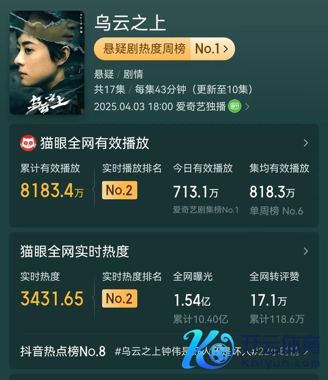 电视剧有着许多种类型,每一种齐有着可爱的东说念主会去留情,昔时的期间天下更可爱看的是偶像剧、是爱情剧,是家长里短,是甘好意思的神志,但是目下不一样了,跟着各种悬疑剧的爆火,不雅众们实在的发现了这一类型剧的精彩之处,剧情用着多样种种的印迹将一个个事件接头在沿途,带领着不雅众们不绝地看下去,就像最近新出的这部悬疑剧《乌云之上》就凯旋的诸多电视剧中火出圈,热度更是不绝高涨。